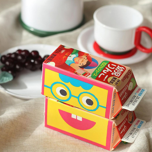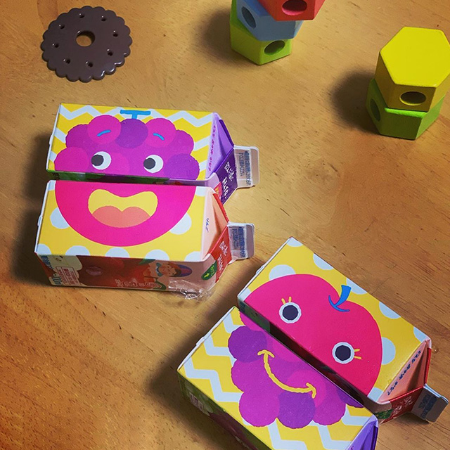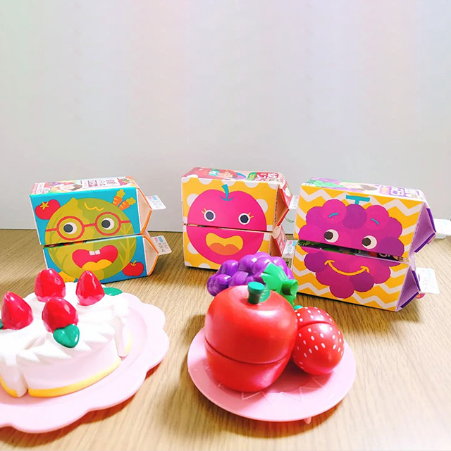 「幼児のみもの」のパッケージ側面にある、絵あわせあそび。小さなお子さま(低年齢の子ども)も認識しやすい、カラフルな色合いです。おいしく飲んで、飲んだらあそべる「絵あわせパッケージ」になっています。